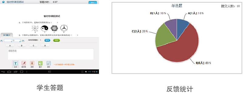 | 測試反饋系統(tǒng) 要求學生在限定時間內(nèi)完成答題,學生提交后可對學生的測試情況進行快速統(tǒng)計,即時評估教學效果,采取相應的教學對策。 |