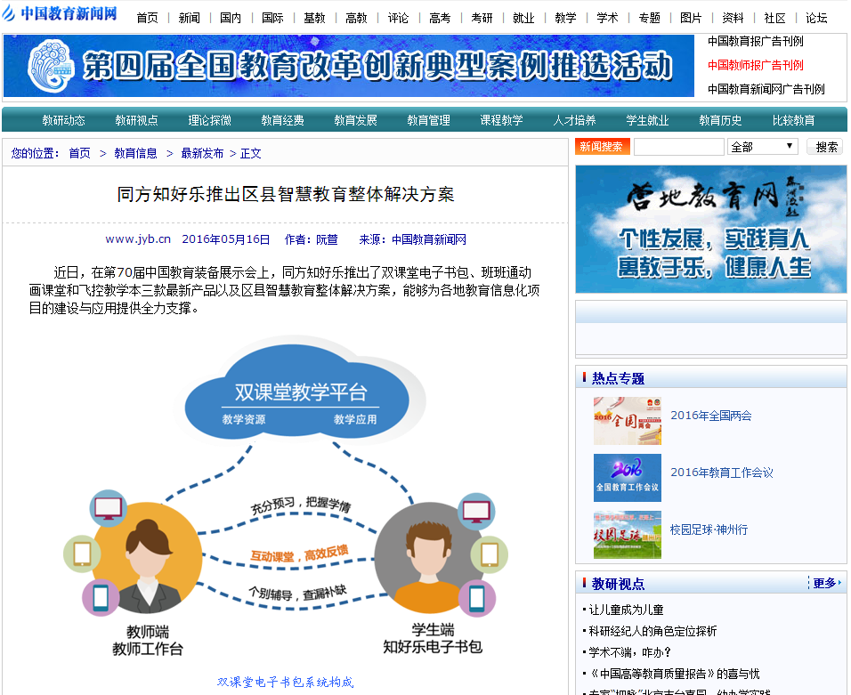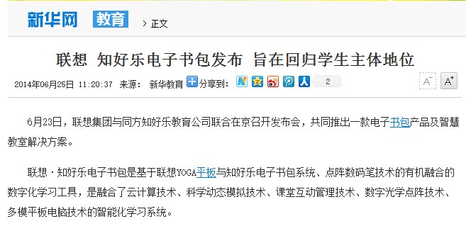 中國教育新聞網(wǎng):聯(lián)想·知好樂電子書包智能化學習系統(tǒng)發(fā)布