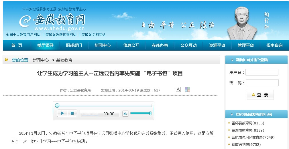 安徽教育網(wǎng):讓學生成為學習的主人--定遠縣省內率先實施 “電子書包”項目