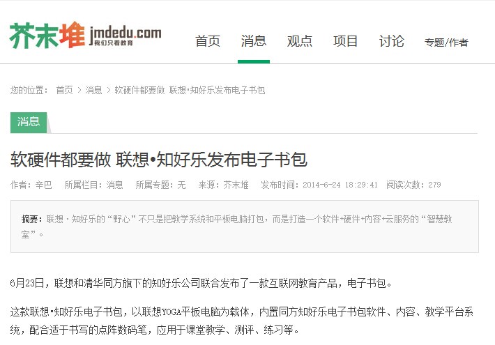 芥末堆:軟硬件都要做 聯(lián)想?知好樂發(fā)布電子書包