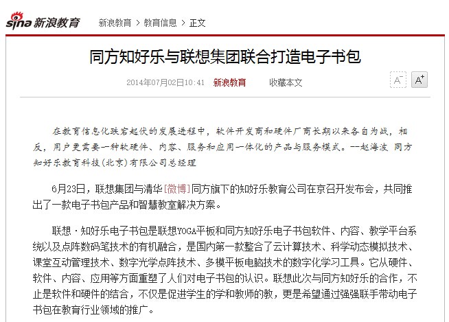 新浪教育:同方知好樂與聯(lián)想集團聯(lián)合打造電子書包