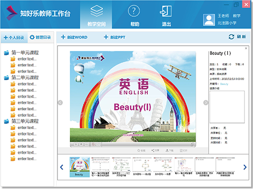 使用客戶端“教師工作臺”:教師在本地電腦制作PPT課件,一鍵插入平臺資源或本地資源,制作完成后,同步到教師空間,同時可以打包下載,通過U盤等方式帶走。