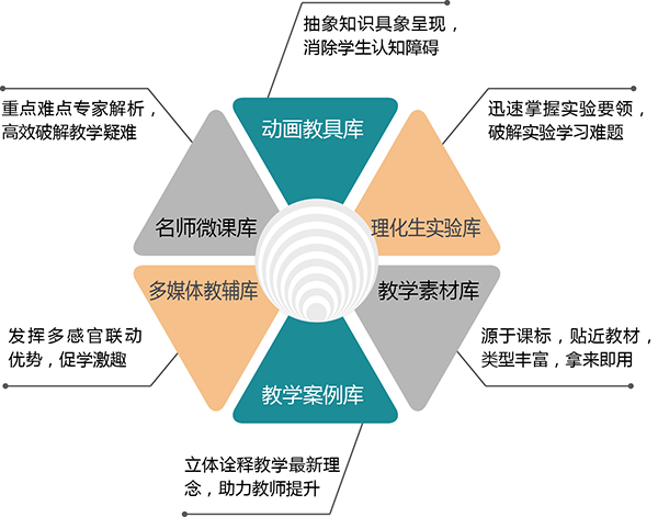 名師微課庫是針對學(xué)生學(xué)習(xí)的重點和難點,借助多媒體教學(xué)手段,由名師進行片段示范講解的系列微課程,包括重難點透析、經(jīng)典試題講解和中高考復(fù)習(xí)專題等內(nèi)容,包含高中共計1070小時、初中共計330小時。   動畫教具庫是以學(xué)科知識點或者教學(xué)主題為單位,針對突破教學(xué)難點和組織課堂交互活動的需求而設(shè)計,可以拿來即用的教學(xué)動畫,是多媒體教學(xué)必備的教學(xué)工具,包含高中4000多個動畫、初中2000多個動畫。